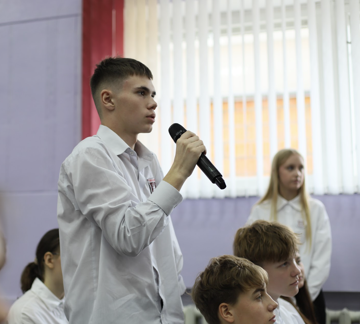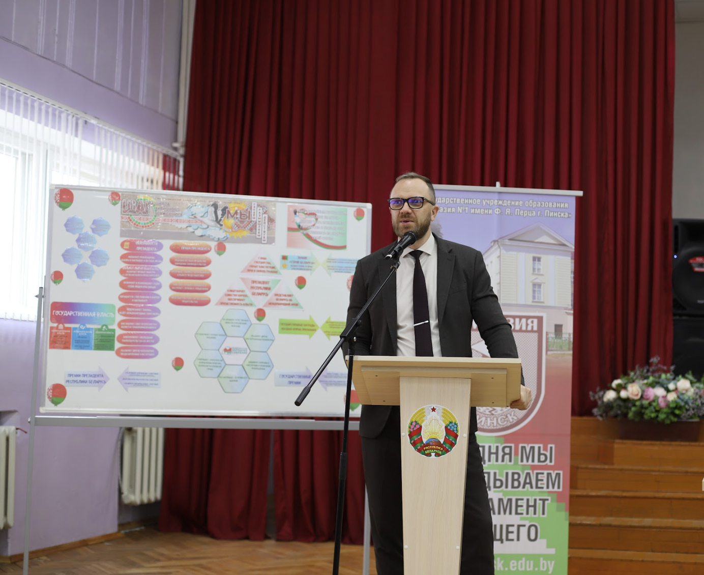 В рамках проекта «Школа активного гражданина» заместитель председателя концерна «Белгоспищепром» Александр Кижук посетил ГУО «Гимназия №1 имени Ф.Я. Перца г. Пинска». На мероприятии присутствовали также начальник отдела идеологической работы и по делам молодежи горисполкома Кирилл Юрченко и заместитель начальника управления по образованию горисполкома Людмила Былинская.