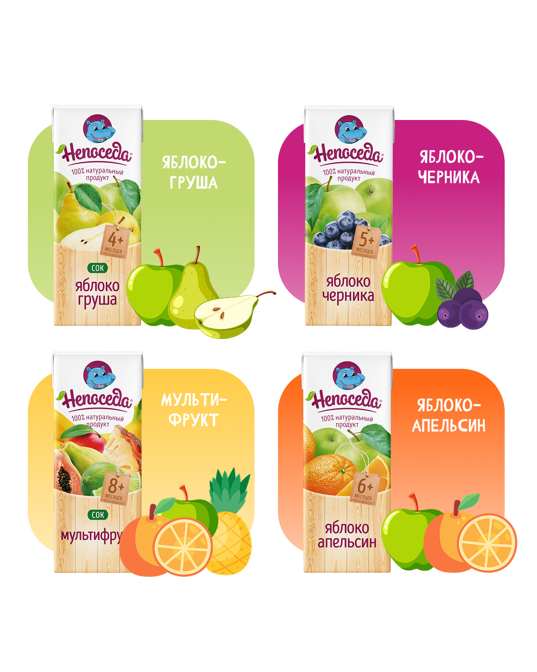 - 200 мл в Tetra Pak с трубочкой ТМ "Непоседа" (яблочный, яблочно-виноградный,яблочно-грушевый, мультифруктовый)