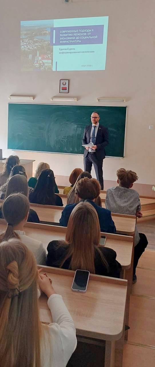 Единый день информирования прошел сегодня и в Минском государственном финансово-экономическом колледже. О современных подходах к развитию регионов: от экономики до социальной инфраструктуры учащимся рассказал заместитель председателя концерна «Белгоспищепром» Александр Кижук.