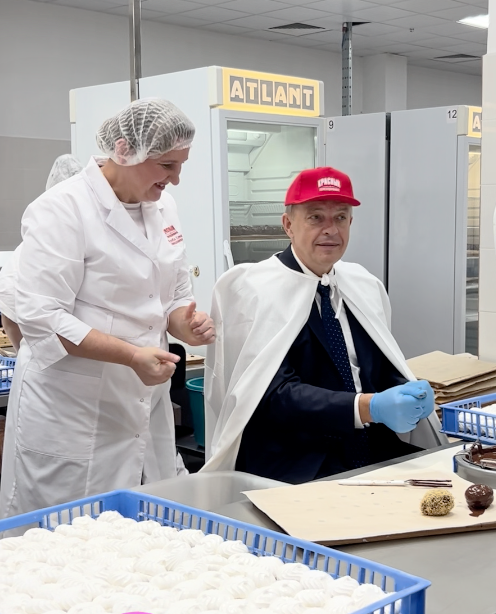 Знаменитый зефир «Одуванчик» и «Метеорит» на фабрике «Красный пищевик» высокие гости — Председатель Палаты представителей Национального собрания Беларуси Игорь Сергеенко и председатель Могилевского облисполкома Анатолий Исаченко — изготовили самостоятельно.