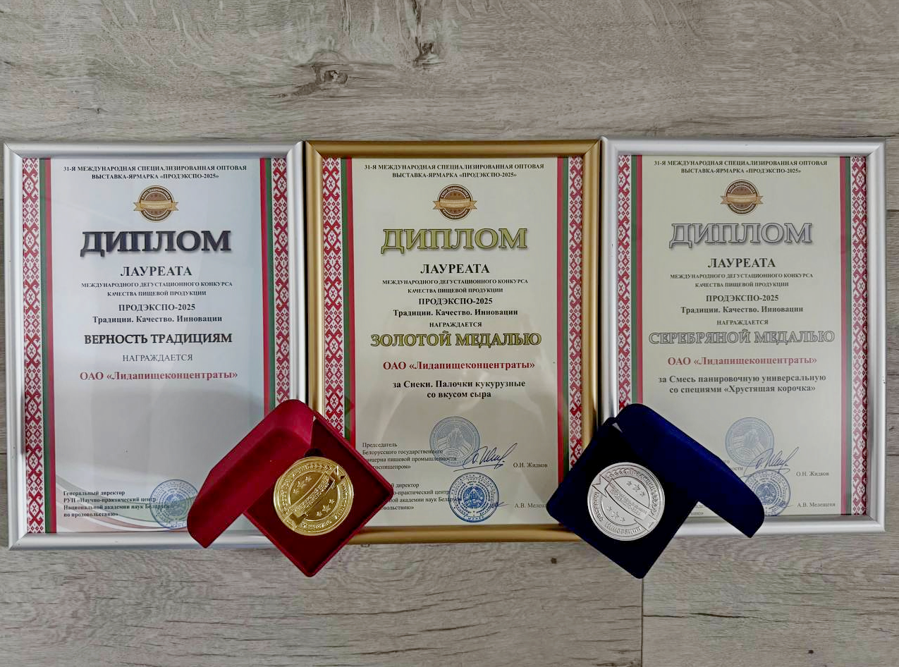 - ОАО «Лидапищеконцентраты»: золотая и серебряная медаль и диплом «Верность традициям»;