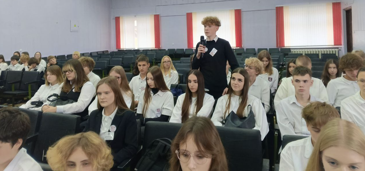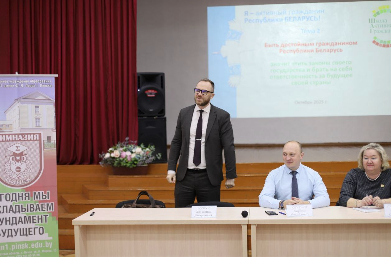 В рамках проекта «Школа активного гражданина» заместитель председателя концерна «Белгоспищепром» Александр Кижук посетил ГУО «Гимназия №1 имени Ф.Я. Перца г. Пинска». На мероприятии присутствовали также начальник отдела идеологической работы и по делам молодежи горисполкома Кирилл Юрченко и заместитель начальника управления по образованию горисполкома Людмила Былинская.