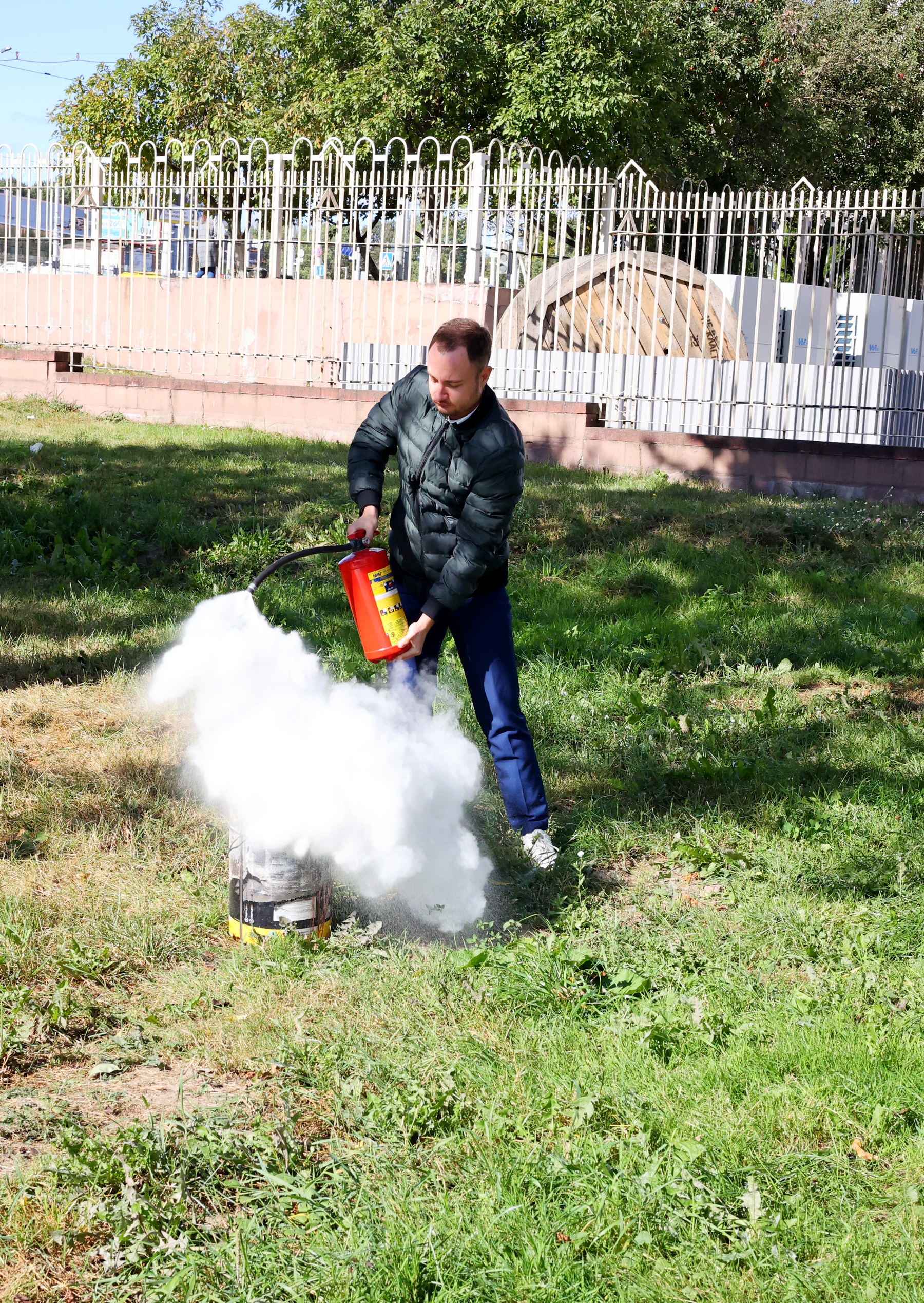 Помимо теоретической подготовки (ознакомление с информационными материалами и видеоматериалами МЧС) во дворе концерна на зеленой зоне была проведена практическая отработка действий при пожаре.