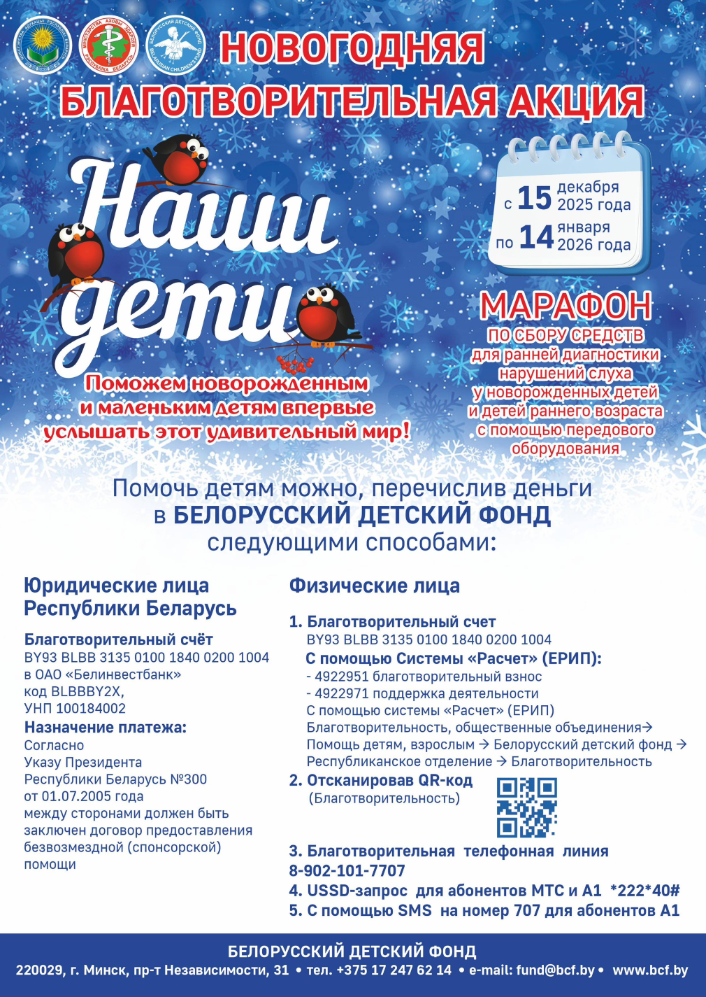 В нашей стране в период с 15 декабря 2025 г. г. по 14 января 2026 г. проходит республиканская новогодняя благотворительная акция «Наши дети», которая ежегодно позволяет оказать помощь и поддержку детям, среди которых дети-сироты, дети, оставшиеся без попечения родителей, дети-инвалиды, дети, нуждающиеся в лечении.